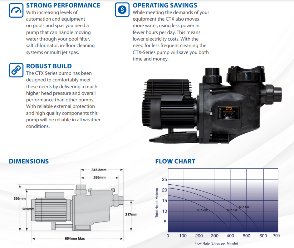 The CTX range retrofits the older Hurlcon CX240, CX320, TX 1.0, TX1.5, TX2.0 Pool Pumps