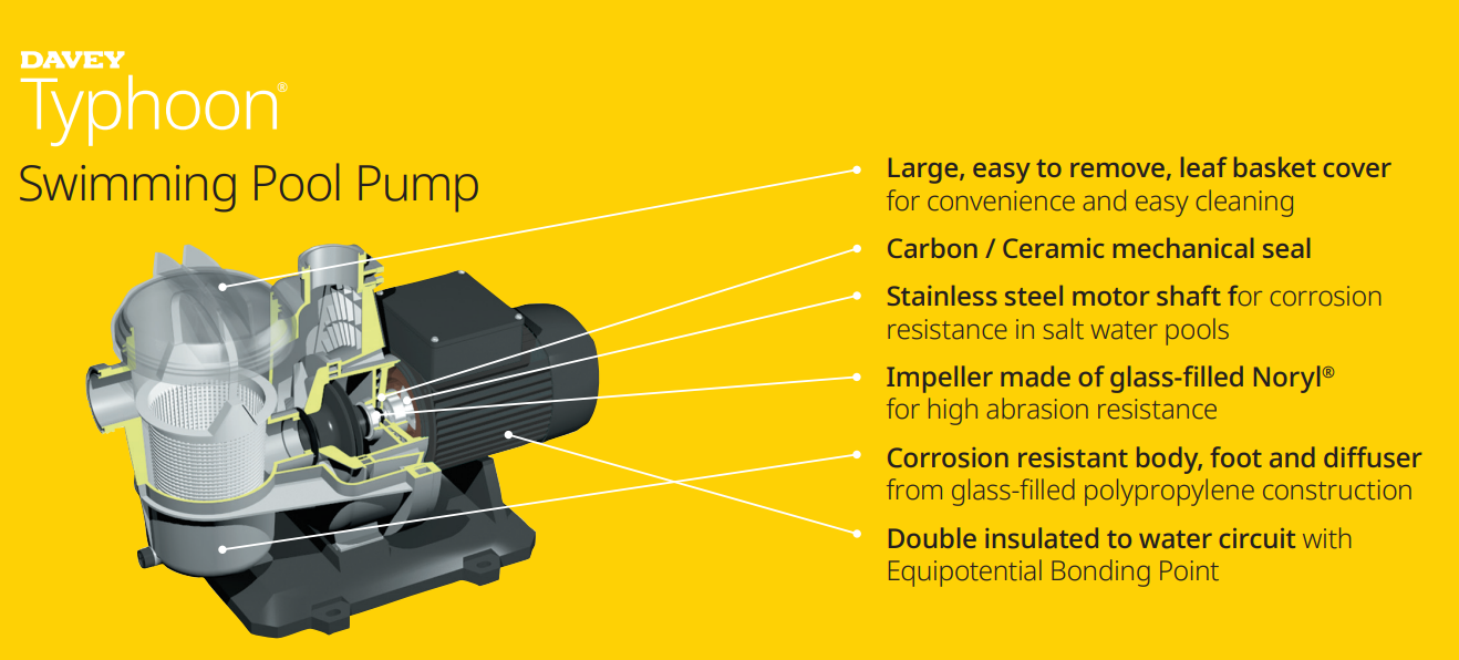 Ideal for filtration, backwashing, water features, spa jet operation and solar pool heating - the Typhoon self-priming pool pump gives you trouble-free operation and deliver optimum performance in your pool or spa.