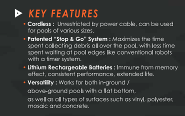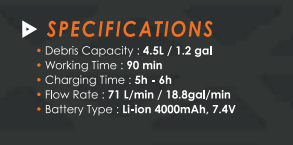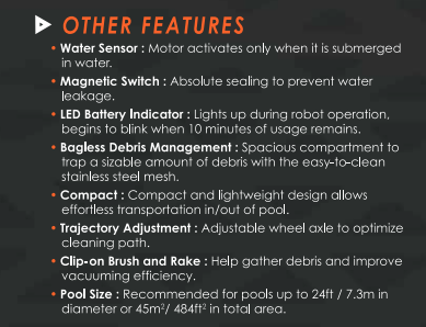 Additional features, such as the water sensor that activates the motor only when submerged, a magnetic switch for absolute water sealing, and a 4.5-litre debris capacity, make the Vektro Auto a reliable and intelligent choice. The LED battery indicator keeps you informed, while its 71-litre per minute flow rate ensures fast and efficient cleaning. With the Vektro Auto, you’ll enjoy sparkling clean pool floors with minimal effort.