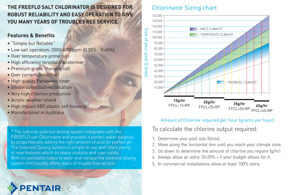 Electrolytic chlorine generation is the easiest, most effective and convenient way to keep pool water sparkling clean. The FreeFlo salt chlorinator uses common table salt to produce all the chlorine your pool needs, right in your pool-safely, effectively and automatically. Designed for the budget conscious pool owner, the Freeflo series by Pentair live up to its motto "Simply Reliable". The Freeflo salt chlorinator is engineered to stand up to the toughest pool conditions and provide years of dependable service.