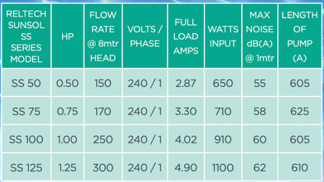 Reltech's SUNSOL SS Series pumps are for the budget savvy buyer. The SS Series incorporate the same wet end technology as the PR Series, however, utilise a more cost effective electric motor. They are therefore inherently quiet and ideal for everyday medium head applications, commonly found in small to medium sized pools